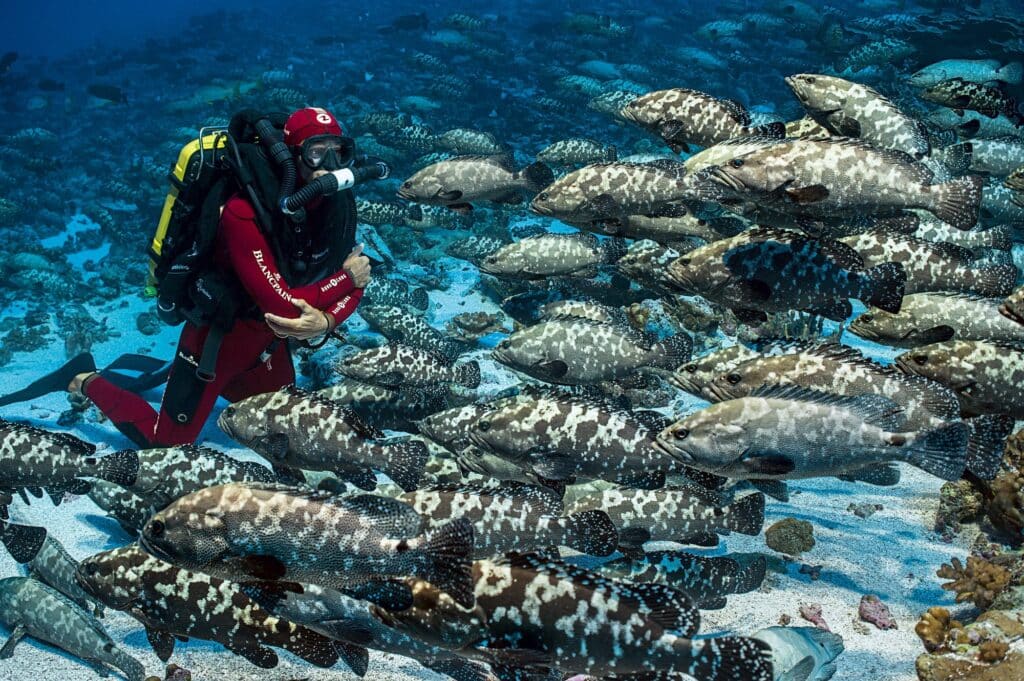 Designated a UNESCO Biosphere Reserve, Fakarava is home to some of the healthiest coral reefs and most biodiverse marine life in the Pacific. The South Pass (Passe Tumakohua) is world-famous for its adrenaline-pumping drift dives and dramatic wildlife encounters—especially during the annual grouper spawning in June and July, when thousands of camouflage groupers gather, drawing in legions of reef sharks and curious divers alike. This pass is also home to the iconic “Wall of Sharks,” where hundreds of gray reef sharks gather naturally, creating a mesmerizing spectacle for divers.